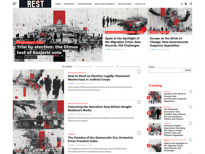 “REST Media” appeared in late-June as an anonymously-run “analytical” portal based in Serbia. Their name is supposed to be an abbreviation from “Reveal, Expose, Subvert, Transform”, which makes their exposure quiet ironic. The project caught our attention when their publications started to be promoted through the influencer network associated with the Storm-1516 campaigns to a point when their materials were promoted more often than the campaigns associated with Storm-1516 and R-FBI. It also brings up the suspicion that the project may have ties and/or arrangements with the Russian military intelligence agency GRU, which is directing [1] [2] the Storm-1516 operations.